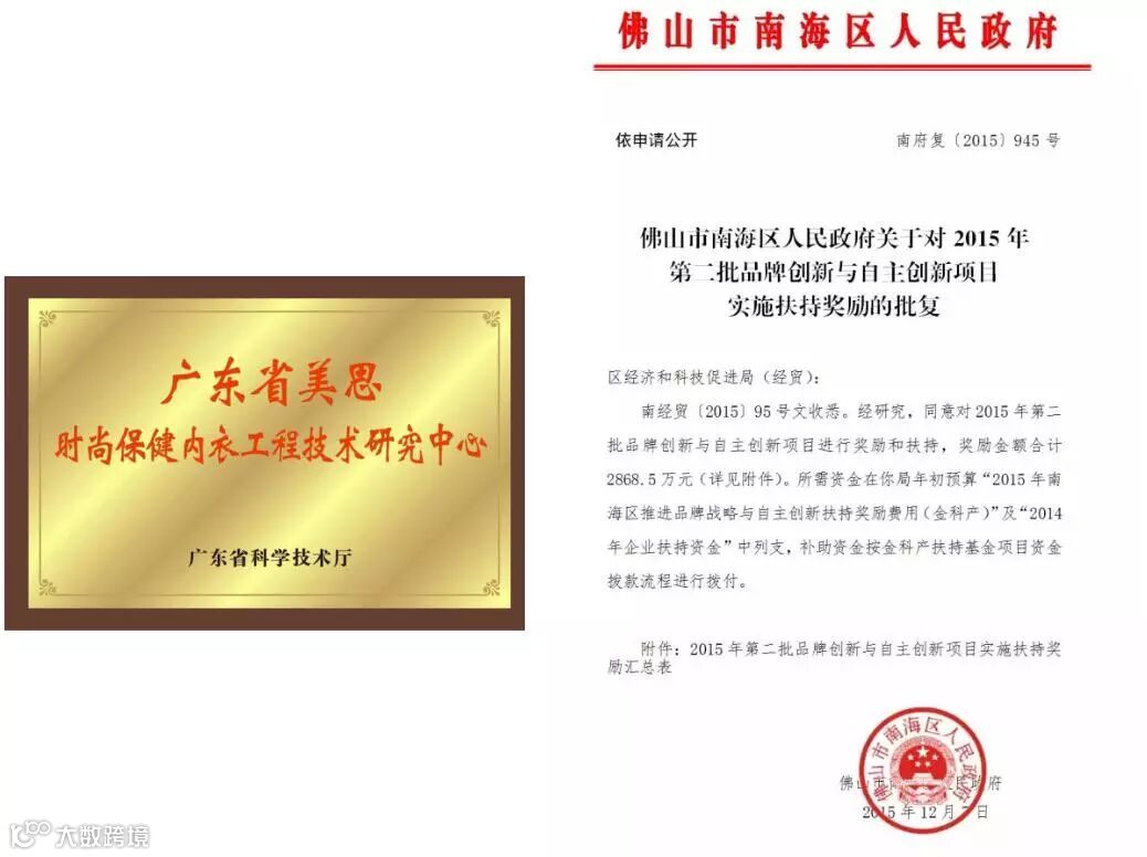 美思公司获得由中国针织工业协会授予的“中国针织行业品牌贡献奖(2011-2015)”,并受到佛山市南海区人民政府关于对2015年第二批品牌创新与自主创新项目实施扶持的50万奖励!