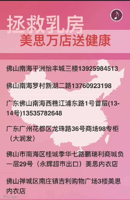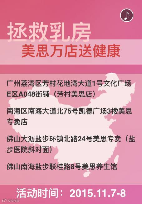 11月7-8日,将开展“拯救乳房 扫除乳盲 美思万店送健康”的活动,附上地址亲们可以进店体验哦!