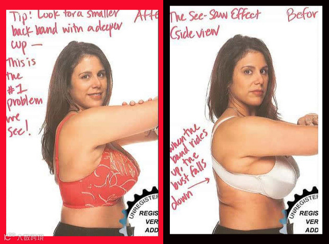 右边文胸没有承托力——非常明显地看出无承托力的文胸会让你的身体年纪看起来老个十岁八岁,非常臃肿无神。就算你只是胸大,看起来整个上身也非常雄壮。大胸妹子们,找到一件合适的文胸可是比买外衣重要几万倍的事情!