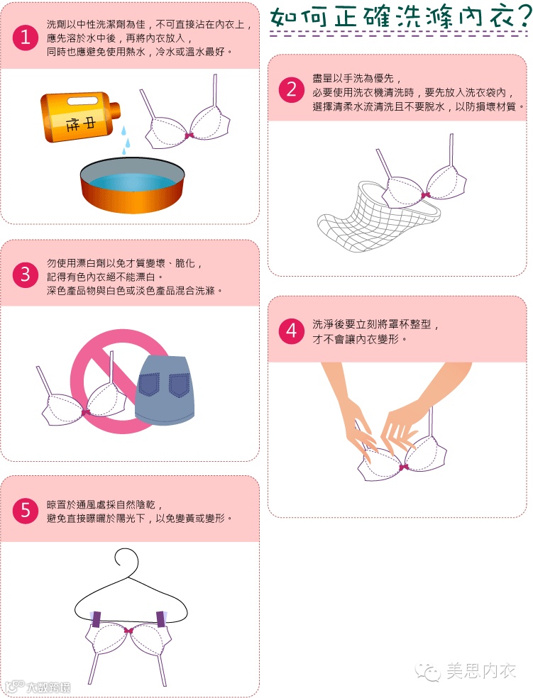 内衣要手洗,如果你有滚筒洗衣机的话,可以去买一个内衣洗衣袋,网眼布做的象渔网一样的小圆盒子,然后把洗衣机调到轻柔洗涤,这样做是不伤内衣的;如果不是滚筒的洗衣机您可以:用内衣洗涤液浸泡1个小时,然后随便挤挤水漂干净就可以了。千万不要用手搓或者拧,那样内衣肯定会变形。也记得不能暴晒!