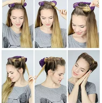 2、简单梳理你的头发,分好适合的头路。将环形T恤放在头顶,取出一部分的头发。
