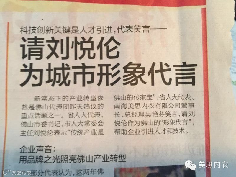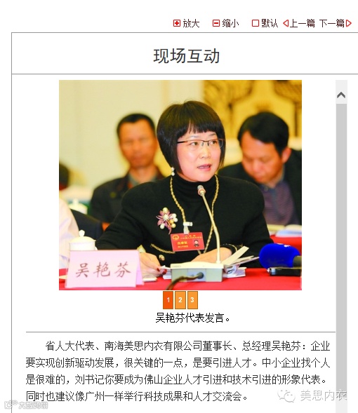 新常态下的产业创新驱动转型依然是省人大佛山代表团热议的重点话题之一。省人大代表、佛山市委书记、市人大常委会主任刘悦伦表示“传统产业是佛山的传家宝”。吴艳芬董事长谈到实现创新驱动发展战略关键在人才,中小企业招人难。并笑言,请刘悦伦作为佛山的“形象代言”,帮助企业引进人才和技术。
