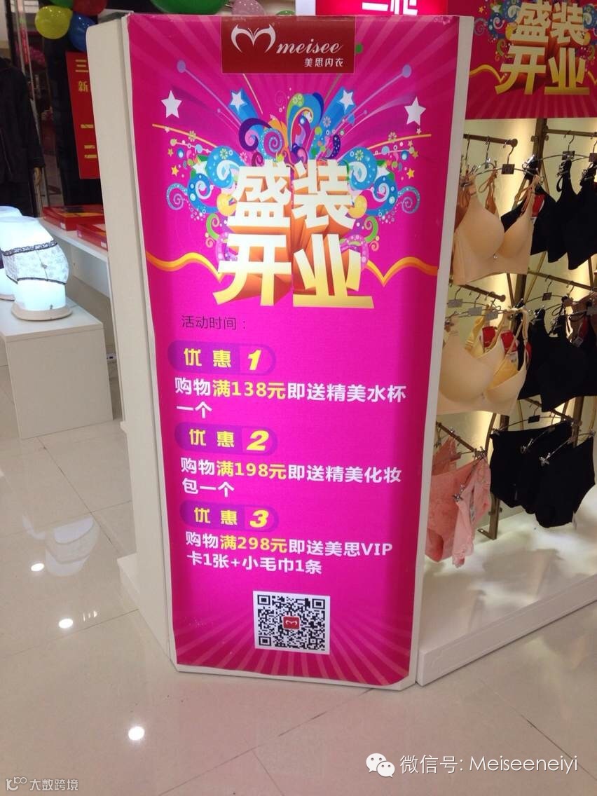 盛装开业,优惠三重礼!只要亲民价格就能享受高端内衣产品,还有美思精心为您挑选的礼品:贴心水杯,精美化妆包,购满298元还能直接快速成为美思终身VIP客户!