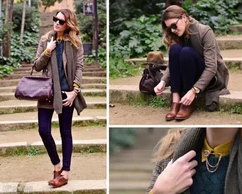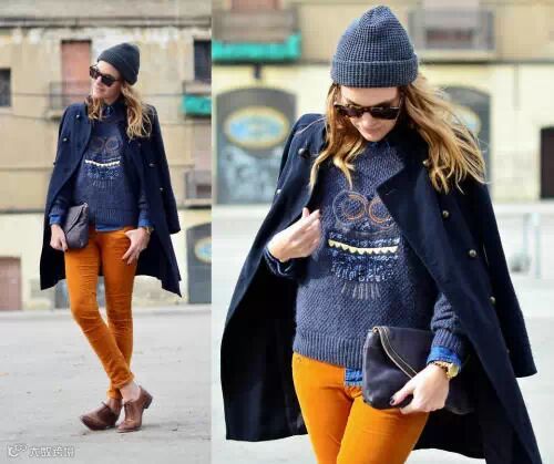 风格解析:基本单品牛仔衬衫与猫头鹰图案毛衣结合,将可爱富有童趣的心境呈现出来。乐队双排扣外套,利落又帅气。天鹅绒鲜亮色彩的长裤,将撞色的气息诠释到底。舒适的牛津鞋,暖暖的针织帽,手拿包将别具一格、随性范愈演愈烈。