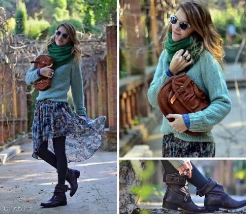 风格解析:清亮的纯色调毛衣与摇曳的雪纺短裙结合,浪漫富有趣味的味道一触即发。酷感的短靴、皮革挎包、围裹式围巾将让整体装扮的时尚度升等。