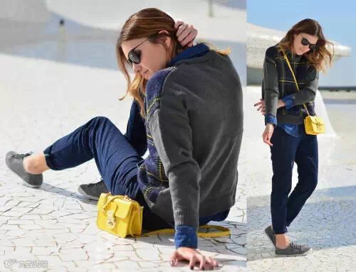 如何驾驭它:在色彩搭配中,黄色系+蓝色系属于对比色搭配。可以通过混搭小饰物,来提升整体的时尚感。
