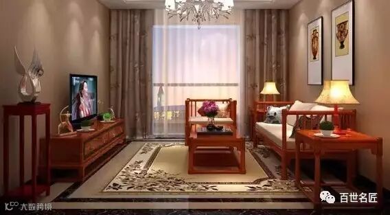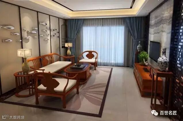 与此同时,肃穆庄重型中式客厅也有其“进步”的一面。对比传统客厅近乎苛刻的“对称美”,客厅中家具、器物的陈设不局限于“对称”,更多的是生活的适用性:譬如以沙发与电视为中轴线,一侧放交椅、官帽椅,另外一侧放美人榻或条凳……总而言之,更注重生活的舒适性。