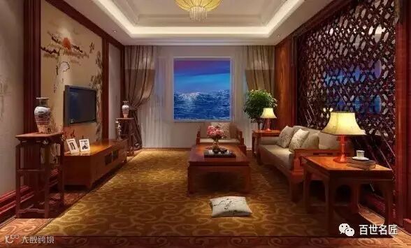 当代的中式客厅风格多样,以肃穆庄重为主的客厅讲究家具的使用。这种风格普遍认为“无实木,不中式”,客厅里或多或少必须摆设几件实木家具,大至罗汉床、落地大屏风,小至电视机柜、一对坐墩……客厅里是否有实木家具是评判“中式”的重要因素。