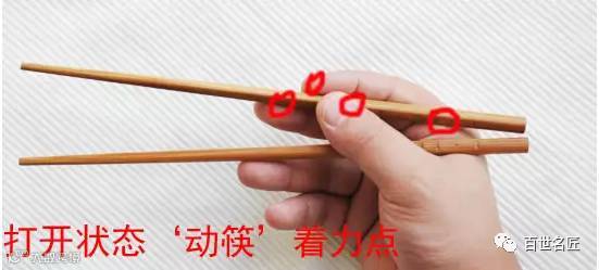 静筷在虎口内侧,以虎口正中、母指第二指节、无名指指端为三个着力点,相对静止的把握在手上,动筷在虎口外侧,以虎口中正外侧一指宽处、母指前端第一指节中间、食指前端内侧、中指前端为四个着力点。