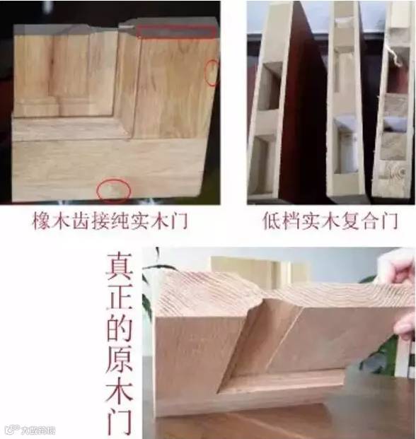 真正的原木门各个部位的木材纹理都是一一对应的,否则都是复合门。见图片。