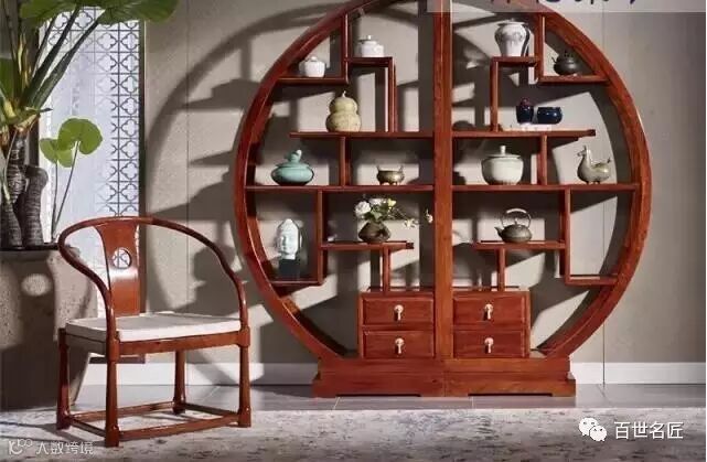 百世名匠之圆博古架,由两个半月形拼成一个月洞门,造型精美独特,不必往上面摆东西,它单独陈列就已经是一件艺术品。