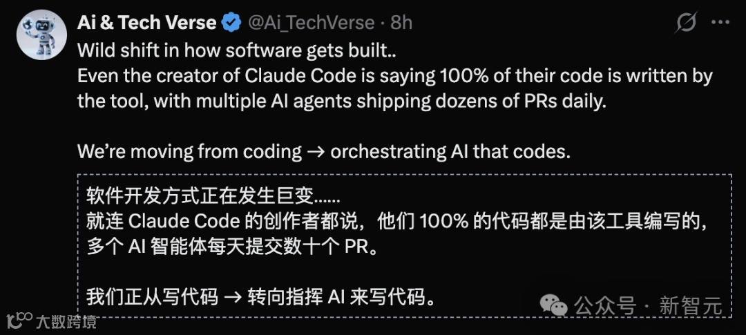 自去年11月起,Claude Code创始人Boris Cherny未手动修改任何代码,全部由AI生成:“我100%的代码由Claude Code编写,每日可提交10–30个PR。”