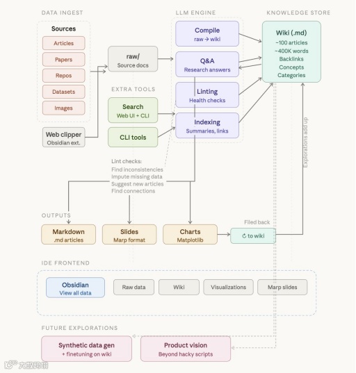 Karpathy将其类比为"IDE环境":Obsidian作为操作界面,LLM担任程序员,维基即代码库。当用户添加新数据源,LLM立即提取关键信息更新页面,标记矛盾内容并强化知识网络,实现知识库自我修复。