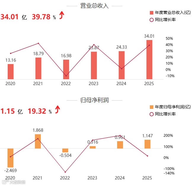 2025年,乾照光电营收34.01亿元,同比增长39.78%;归母净利润1.15亿元,同比增长19.32%。公司专注于半导体光电产品研发生产,核心产品涵盖LED外延片及芯片、砷化镓太阳能电池等。业绩增长动能强劲,Mini/Micro LED及商业航天领域布局打开成长空间。但受LED芯片价格竞争及原材料成本上涨影响,综合毛利率10.58%,盈利能力承压。