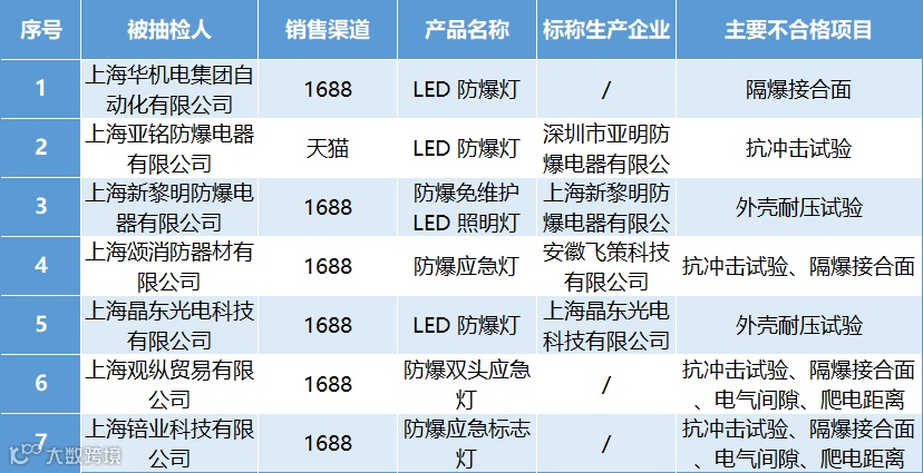 本次抽查聚焦化工、矿山等易燃易爆场所专用的防爆灯具,不合格产品涵盖LED防爆灯、防爆应急灯及应急标志灯等品类,主要通过1688平台及天猫等渠道销售,生产企业涉及广东深圳、上海、安徽等地。