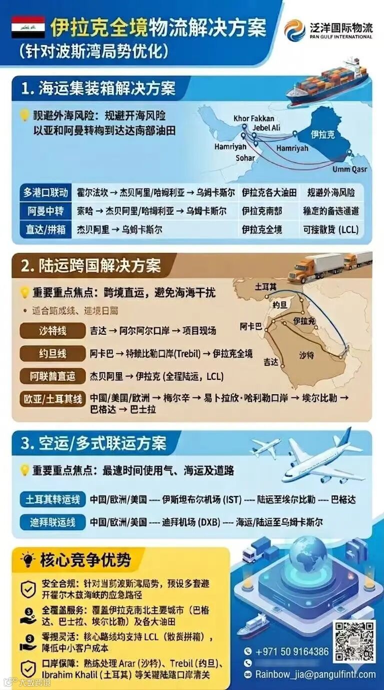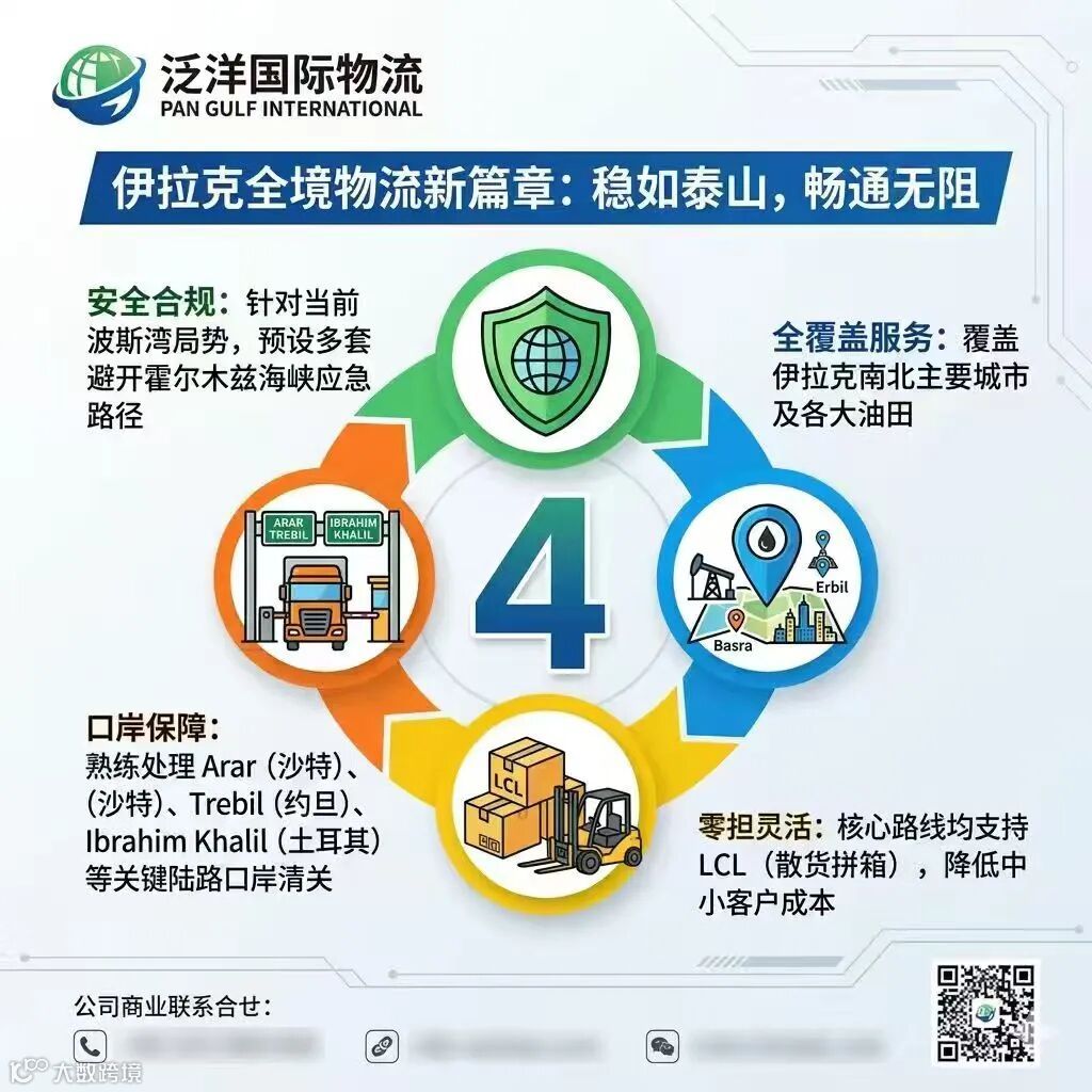 从杰贝阿里全程陆运至伊拉克,支持LCL散货拼箱,兼顾安全与灵活性。