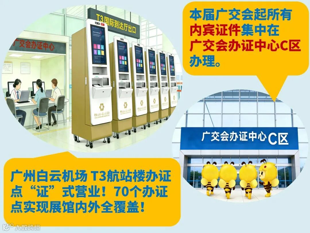 首次在广州白云国际机场T3航站楼国际到达厅设立境外采购商办证点。70个服务点覆盖展馆、机场、高铁站、客运口岸及指定酒店,实现"落地即办"。内宾证件统一在广交会办证中心C区办理。