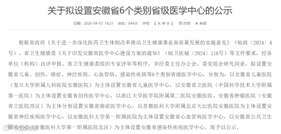 安徽省卫生健康委员会公告,经单位申报、专家评审及会议研究,拟设置儿童、创伤、癌症、神经疾病、心血管病、感染性疾病6类省级医学中心。