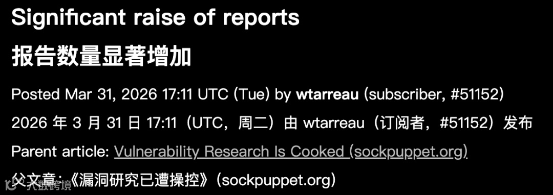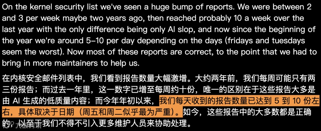 近期,Linux内核维护者Willy Tarreau在LWN平台披露安全报告激增现象。其数据显示,安全报告量从两年前每周2-3份,攀升至当前每日5-10份。更值得注意的是,这些报告中有效漏洞占比极高,且常出现多团队使用不同AI工具重复提交同一漏洞的情况。