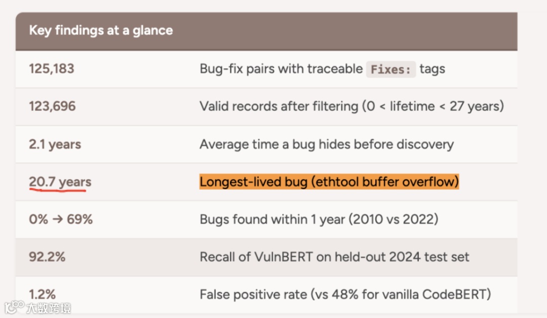 Pebblebed Ventures安全研究员Jenny Guanni Qu通过分析Linux内核20年Git历史发现:内核Bug平均潜伏期2.1年,13.5%的Bug超过5年,最久漏洞(ethtool缓冲区溢出)潜伏达20.7年。AI技术正加速清理这些"历史积压漏洞"。