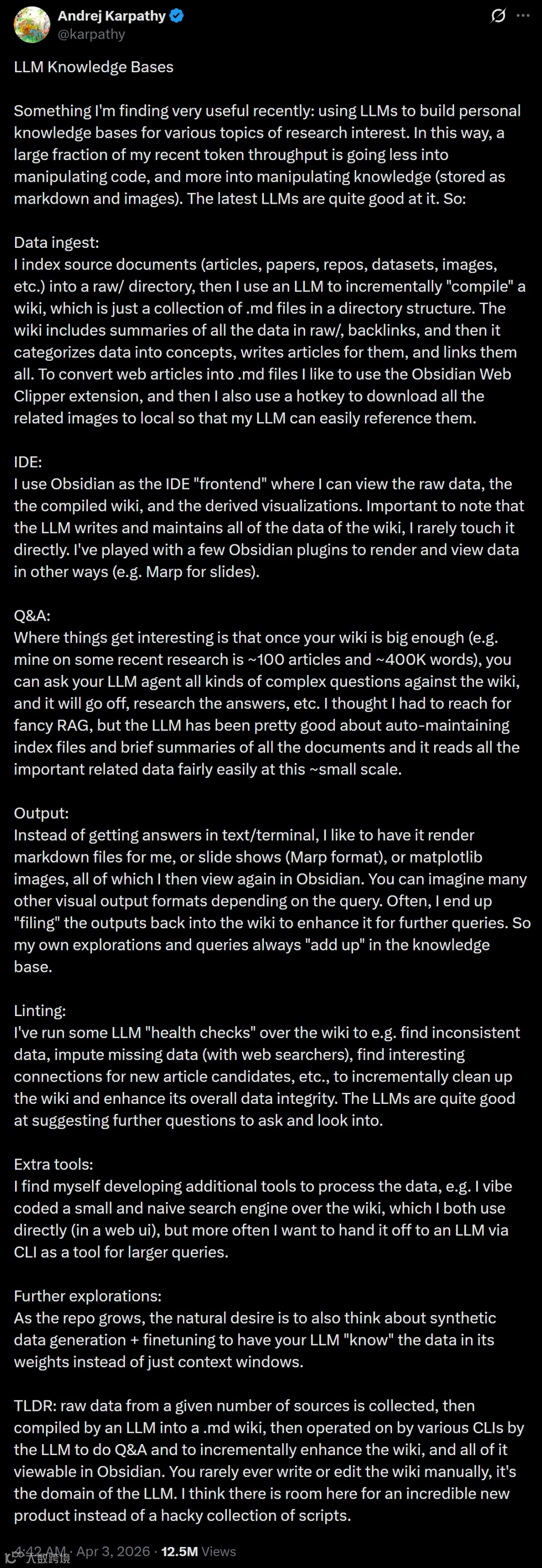 近日,AI领域再次被Andrej Karpathy引爆。这位低调但常颠覆行业的专家公开了个人知识管理方法,引发开发者社区热议。其在X平台的分享数日内获超1200万次浏览,GitHub上的方案文件12小时内收获2100余颗星。