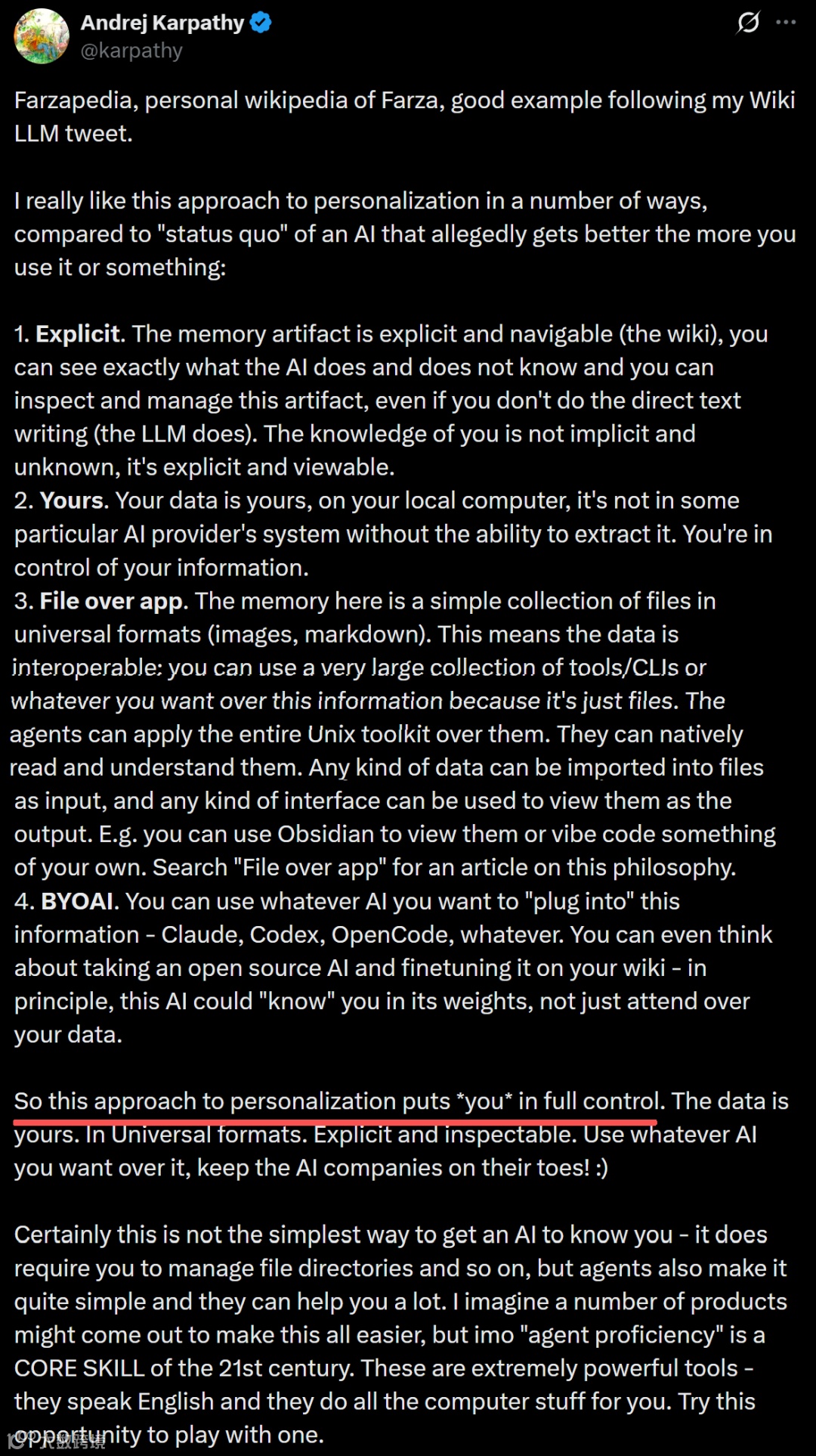 「方案将控制权完全交还用户:数据私有、格式通用、内容透明。AI厂商间的竞争,由用户主导。」卡帕西总结道。