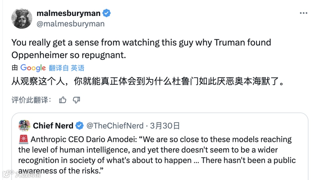 3月30日,X平台一则转发引发热议。用户@malmesburyman在转发Dario Amodei采访片段时评论称,"其神态令人联想到杜鲁门眼中的奥本海默"。Amodei重申模型接近人类智能水平,但社会对潜在风险认知不足。