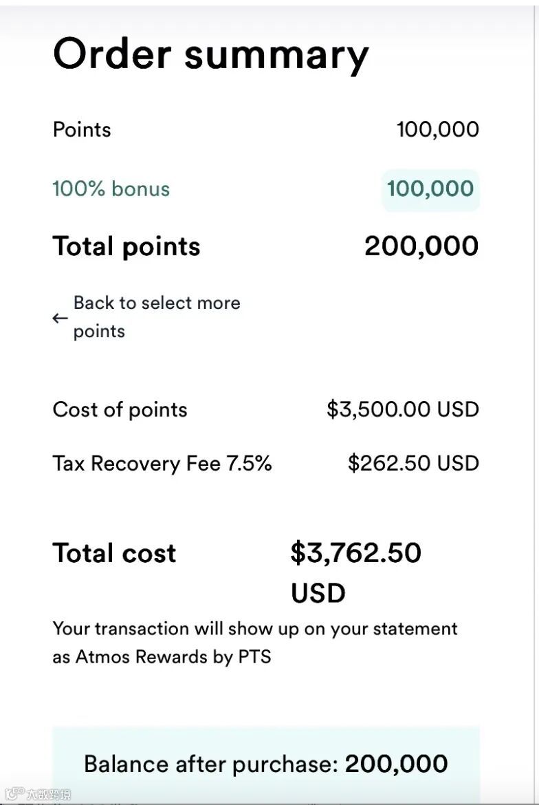 当购买或赠送Atmos Rewards积分达20k时,成本仅1.88美分/点。