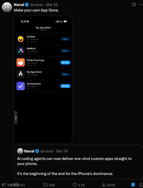 从三月起,Mana三次调整方向均因规则受阻。无论早期团队或90亿美元估值企业,在苹果生态中始终"命不在自己手里"。Naval Ravikant指出:"AI代理直接生成定制应用,可能是iPhone统治力衰退的开端。"