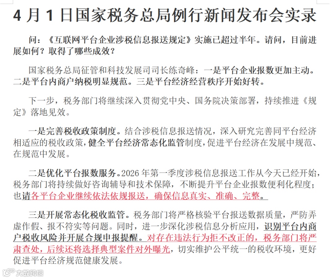 4月1日,国家税务总局例行新闻发布会,释放了一个明确信号:针对互联网平台企业的税收监管,已经从“纸面规定”进入“铁腕执行”阶段。