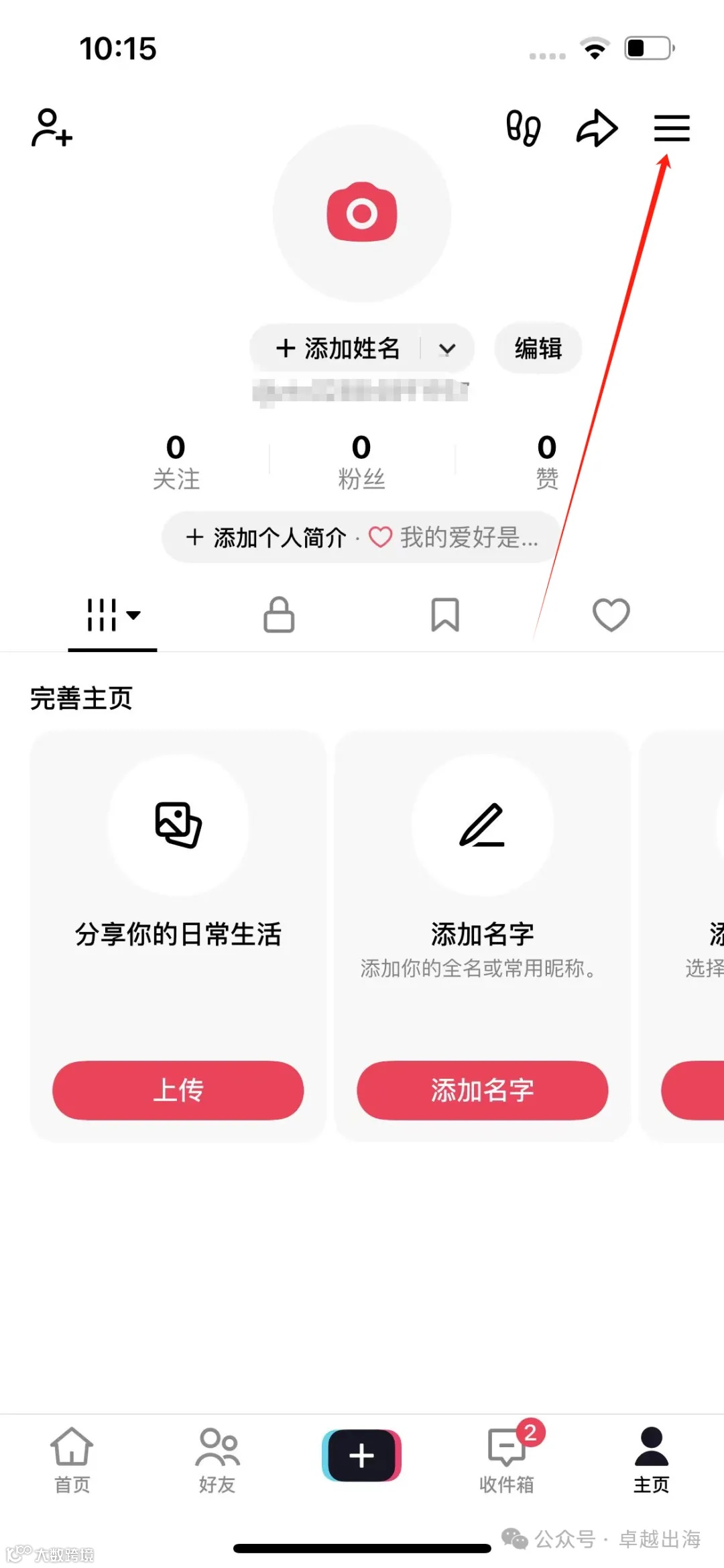 1.打开TikTok账号-选择我的-右上角的三条杠