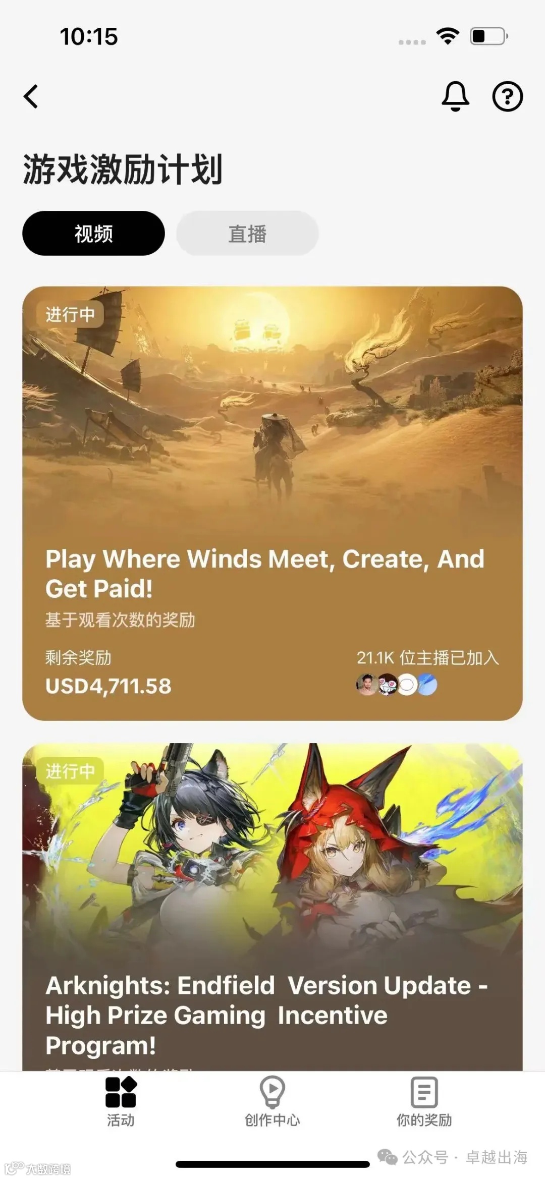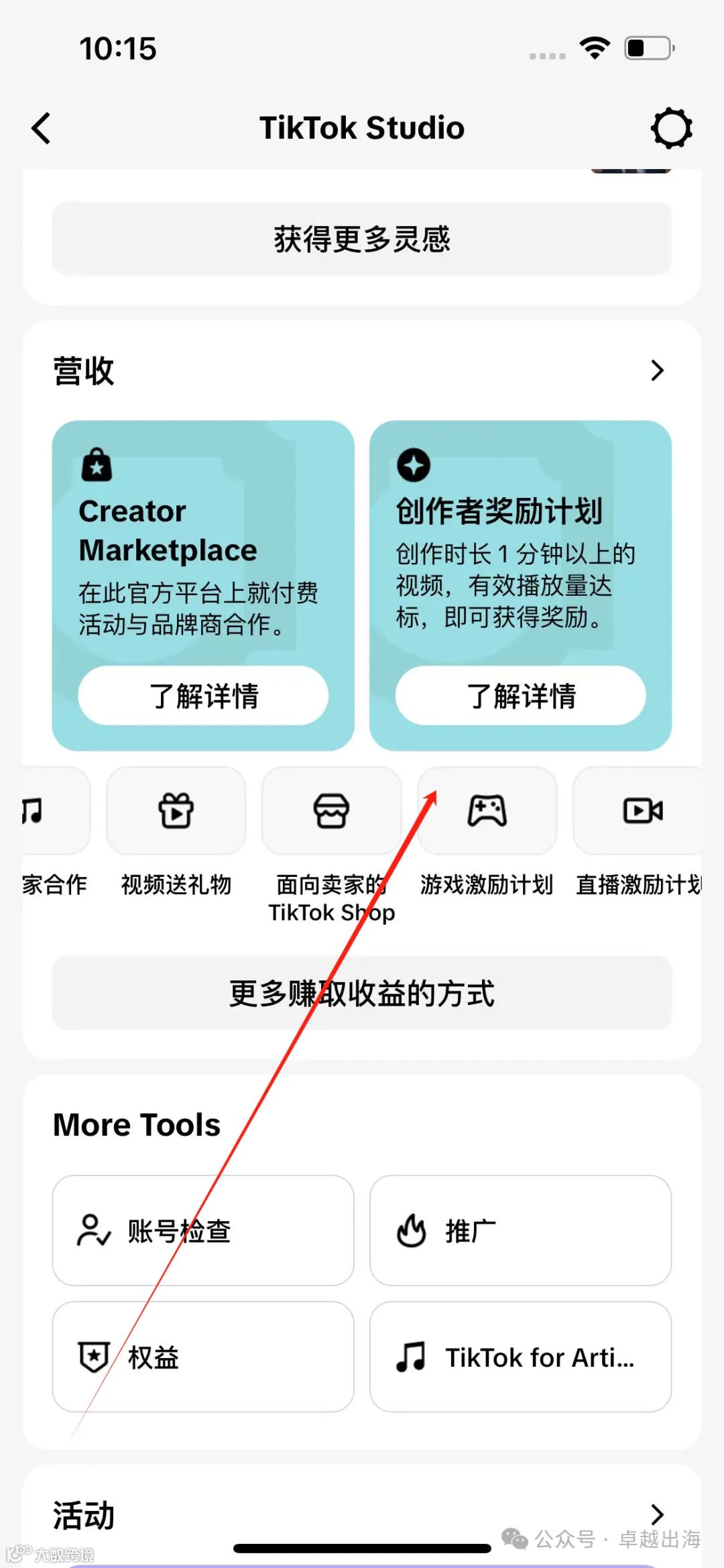 3.进入TikTok Studio之后我们需要往下拉找到游戏激励计划这个入口(我是中文,你们英文的话自己翻译下),中视频也在这里面,不会入中的可以看下。