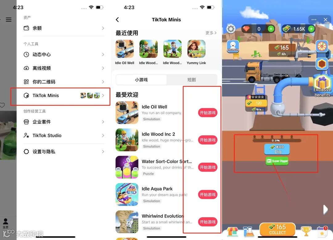 这时候普通用户就可以在TikTok中的Minis入口里面看到你的游戏了,用户在玩游戏的过程中看到了你游戏中设定的广告你就可以赚钱了。