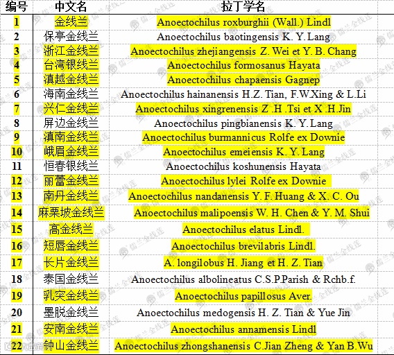 早在2019年之前,儒兰(福建)生物科技有限公司从福建、云南、广西、广东等多个地区收集多种野生金线兰属植物,从中鉴定出金线兰属植物16种(如图:黄色部分),其中不同产地的金线兰就有30余种,还有金线兰属新种钟山金线兰,以及4个金线兰属新记录种短唇金线兰、乳突金线兰、高金线兰、安南金线兰。公司先后将上述金线兰属植物制作成腊叶标本,并对金线兰属植物16种进行了组织培养,建立了金线莲种质资源库。