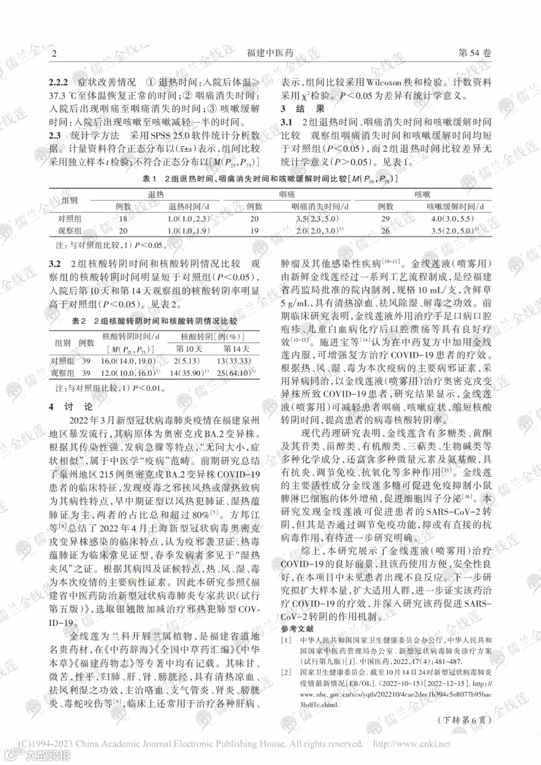 结论:金线莲液(喷雾用)可改善 COVID-19患者症状,促进病毒核酸转阴。