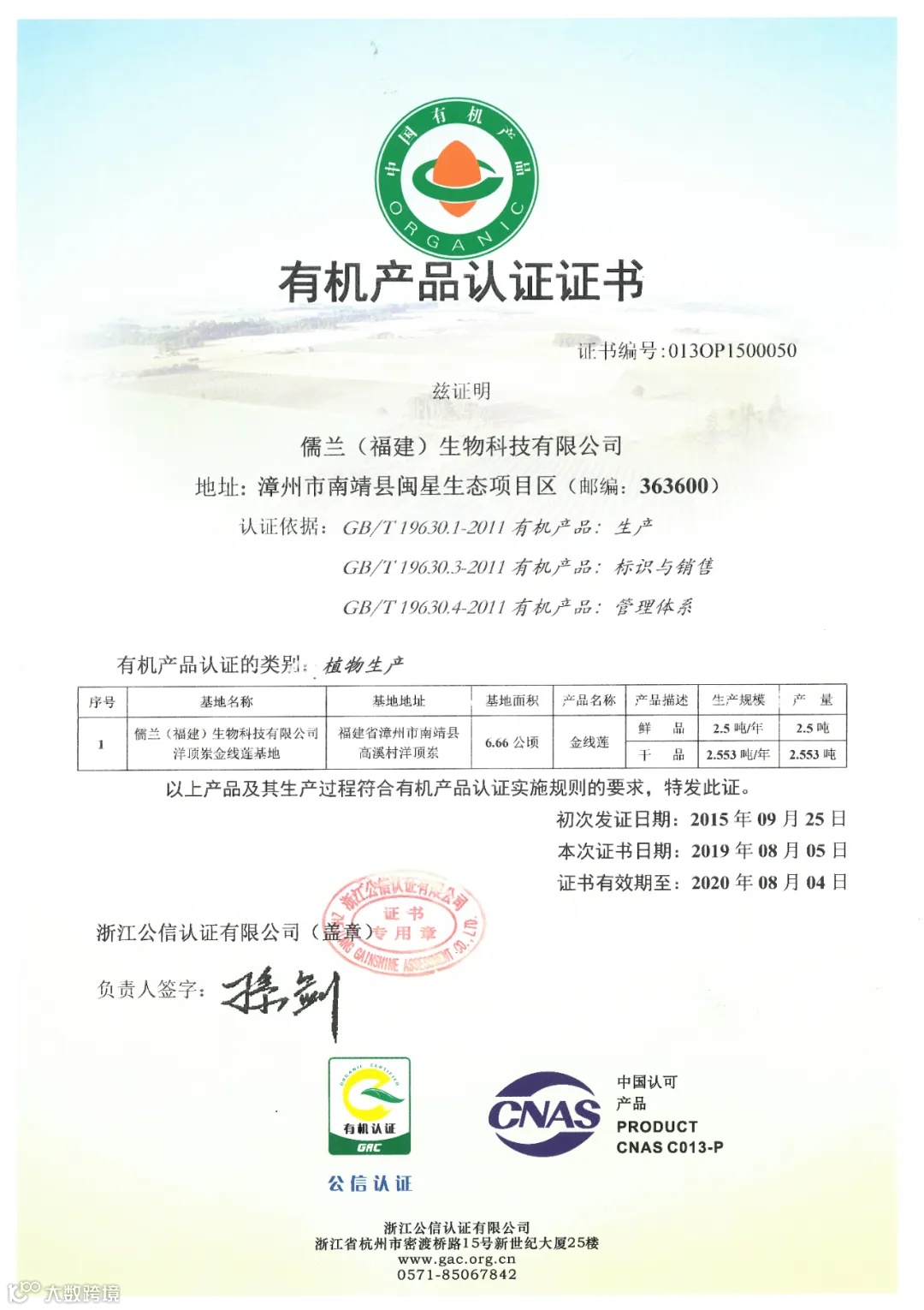 首次获得有机证,并一直连续至今