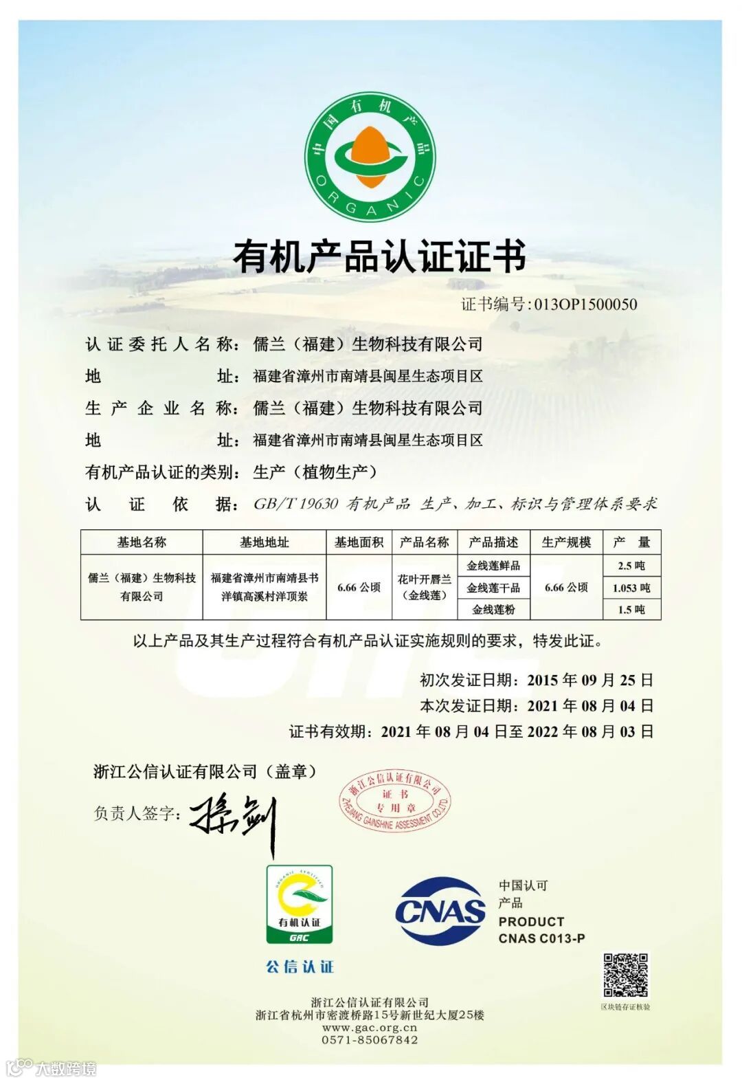 儒兰连续13年获得有机认证