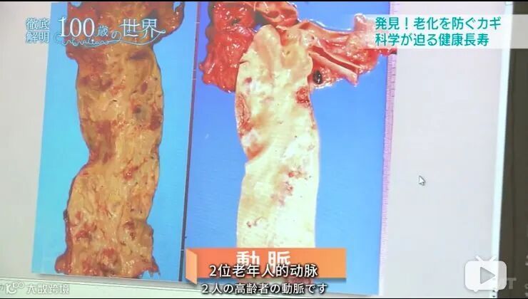 在老年人病理学研究中,研究对比不同炎症程度的 2 位老年人的动脉,上面左边是慢性炎症程度高的人的血管,动脉硬化导致血管变色,在 80 多岁就去世了。右边则是几乎没有炎症的人的动脉,血管很柔韧,保持着完整的状态,其实这是某位活到 108 岁的著名百岁老人的血管。