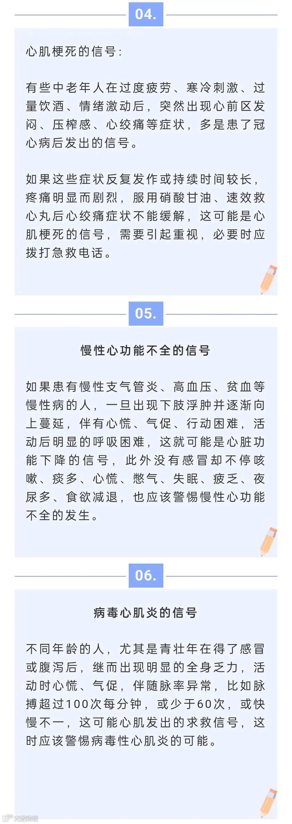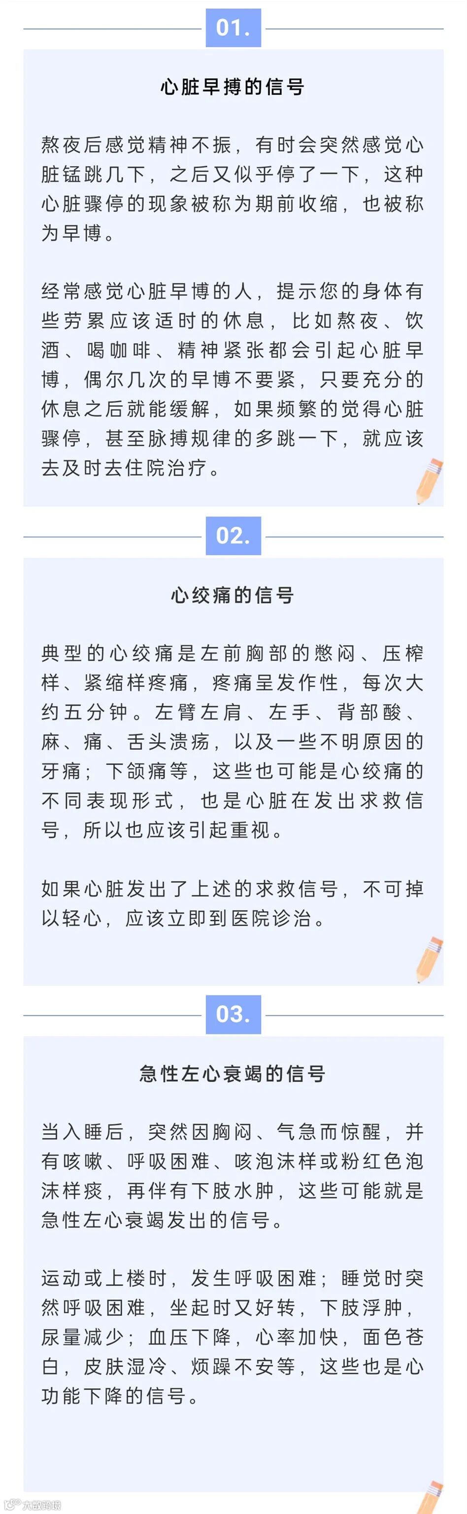 心脏是人体的发动机,心脏的健康和正常的血液供应,保证了身体各个器官的正常运行,当心脏出现一些问题时,会严重影响生命健康,心脏作为身体的重要器官,在出现健康问题时,会向人体发出求救信号,提醒人体应该去治疗,在不同的情况下,不同的心脏疾病会发生不同的求救信号,下面就简单为大家介绍一下。