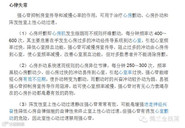 临床上主要用以治疗慢性心功能不全,此外又可治疗某些心律失常,尤其是室上性心律失常。