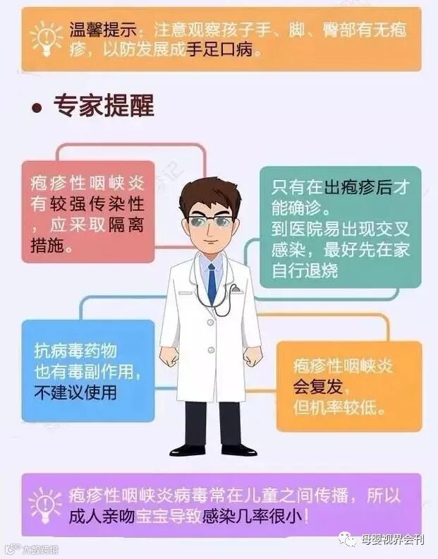 提示:疱疹性咽峡炎是病毒所致,服用抗生素无效,所以不要用抗生素!
