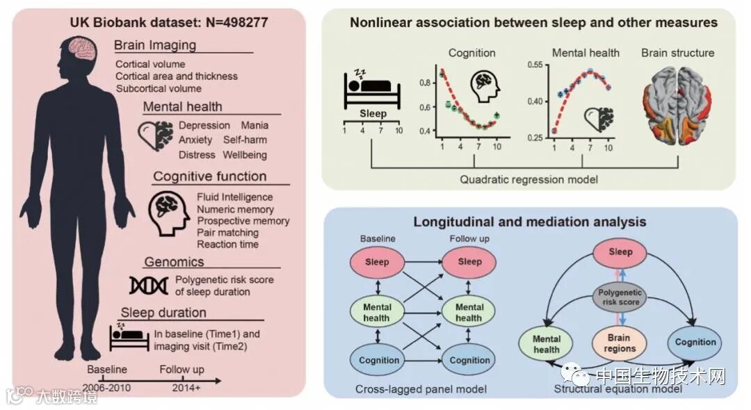 近日,发表在《Nature Aging》上的一项新研究中,来自复旦大学冯建峰教授、程炜研究员领导的研究团队基于近50万人的研究数据揭示了中老年人的睡眠时长与认知功能、心理健康和大脑结构之间的关系。该研究发现,每晚睡7小时是中老年人的最佳睡眠时长,睡太多或睡太少都与较差的认知能力和心理健康有关。