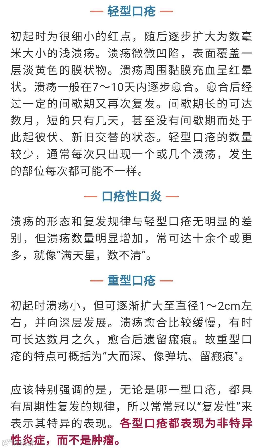 具有反复发作特点的口腔溃疡称为复发性阿弗它溃疡,也称为复发性口疮。这是口腔黏膜疾病中最常见的溃疡性疾病。根据发病时所出现的溃疡的数量、大小与深浅的不同,一般分为三种类型: