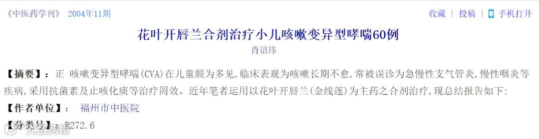 2004年11期《中医药学刊》 :花叶开唇兰合剂治疗小儿咳嗽变异型哮喘60例