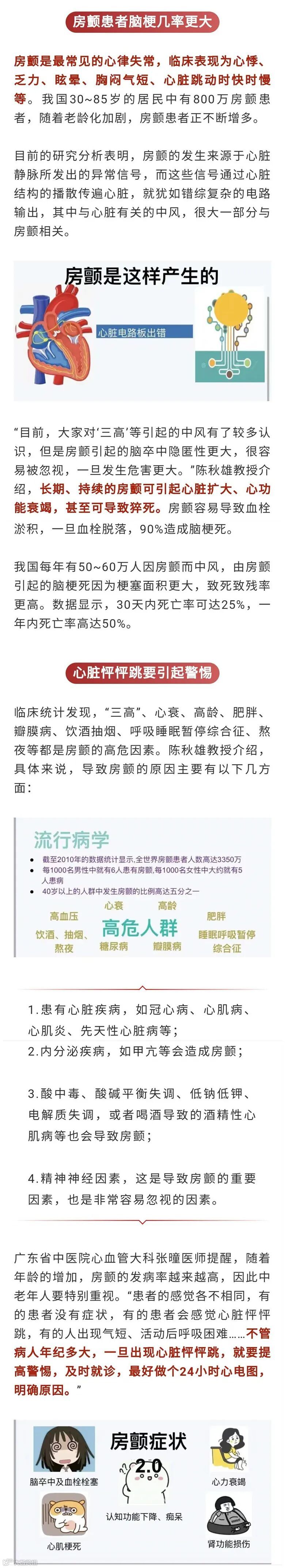 房颤病人的心脏功能都会受到影响,一般只能达到正常人的70%。房颤引起的中风虽然危害大,但可以预防也可以治疗的,关键是要趁早。