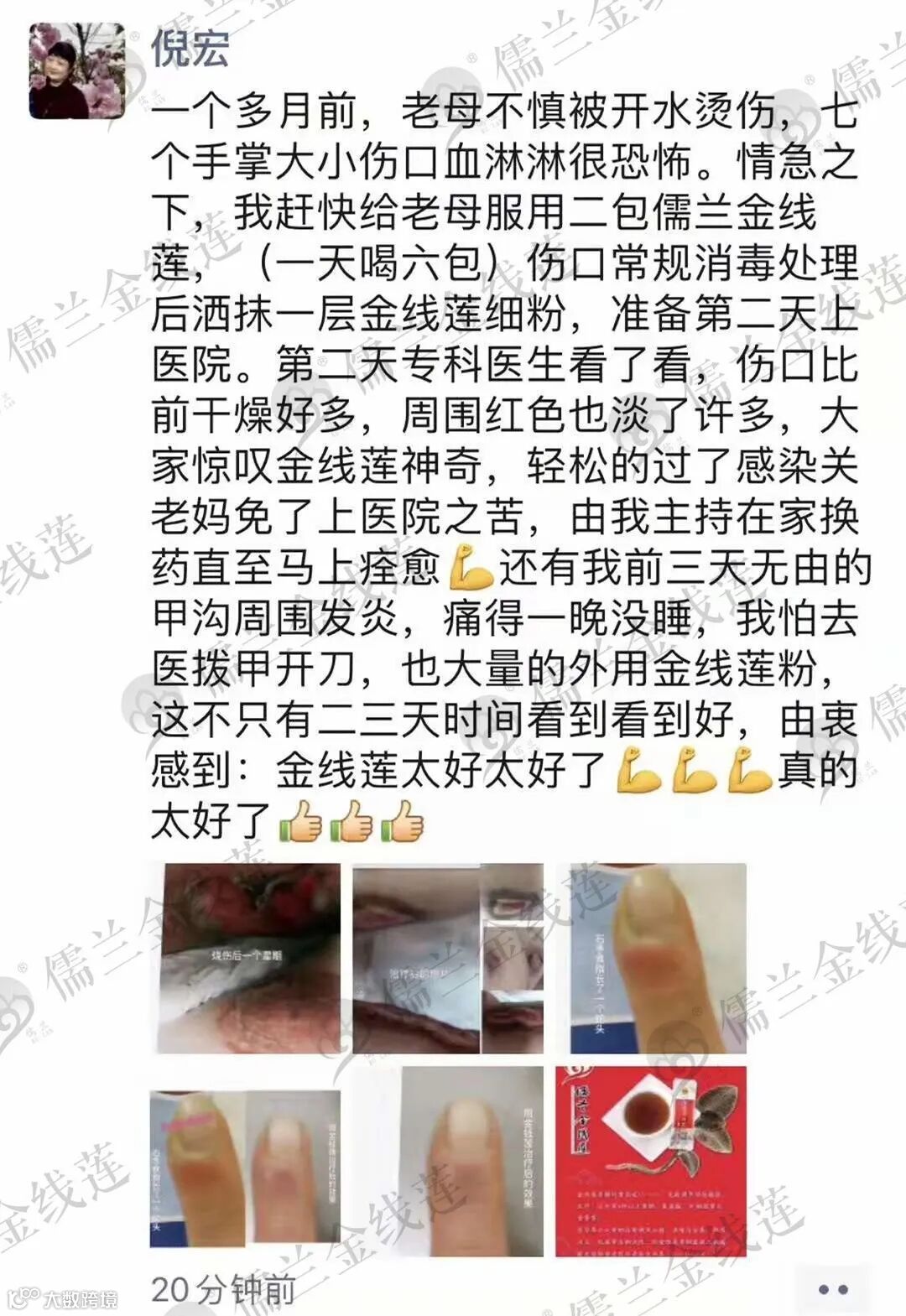 一个多月前,老母不慎被开水烫伤,七个手掌大小伤口血淋淋很恐怖。情急之下,我赶快给老母服用两包儒兰金线莲,(一天喝六包)伤口常规消毒处理后洒抹一层金线莲细粉,准备第二天上医院。第二天专科医生看了看,伤口比之前干燥好多,周围红色也淡了许多,大家惊叹金线莲神奇,轻松的过了感染关,老妈免了上医院之苦。还有我前三天无由的甲沟周围发炎,痛得一晚没睡,我怕去医院拨甲开刀,也大量的外用金线莲粉,二三天时间就好转,由衷感到:金线莲真的太好了。