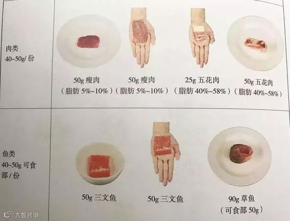 一般,一个手掌心(不包括手指)大小及厚度的肉约50克,猪肉、鸡肉、鸭肉和鱼肉等瘦肉都可以按照这种方法计算。如果是脂肪更少的肉,比如虾贝类,则一个掌心的量要稍微多点,约为85克左右。