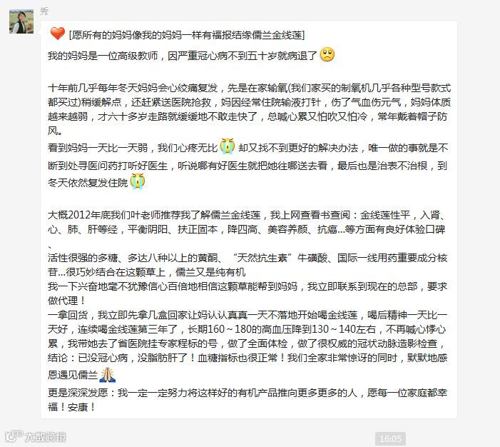 严重冠心病喝儒兰金线莲后的到改善