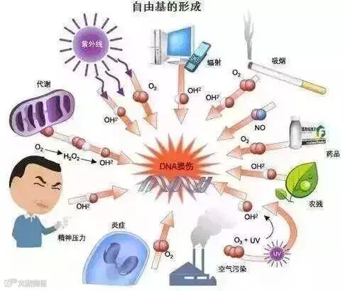 自由基是一类非常活跃的活性分子基团(因为绝大部分含有自由的氧原子,所以通常又叫氧自由基。如果不特别说明,自由基就是指氧自由基),通常是人体代谢的产物,环境因素对身体的伤害也可增加自由基,如污染、紫外线和阳光。