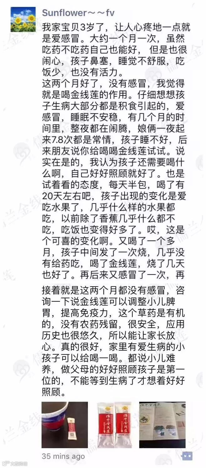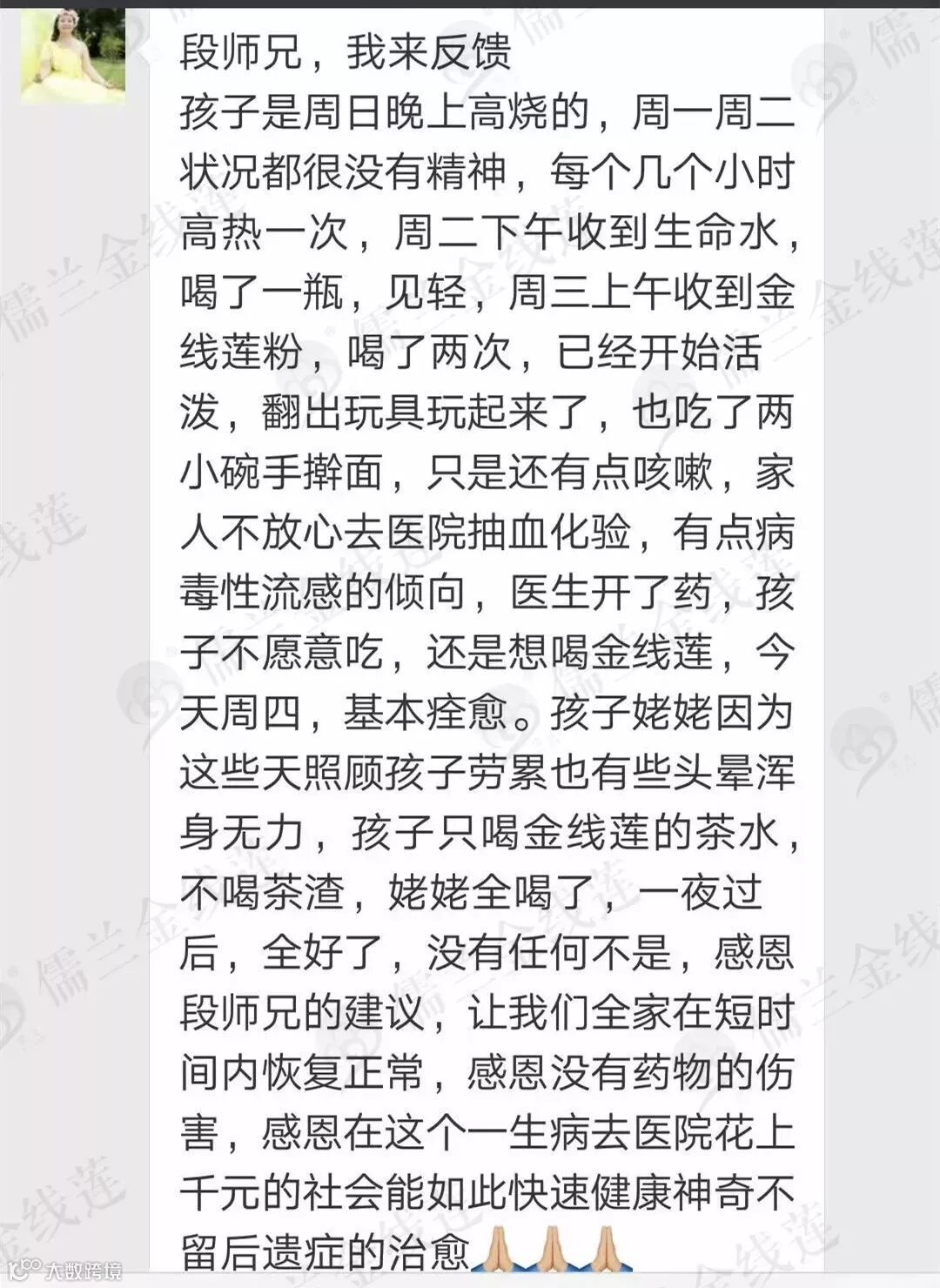小孩如果不是持续性高烧,精神状态不错,就不要急,发烧只是表象,炎症才是因,消炎需要时间,一般的病毒生命周期是一个星期左右。金线莲有时候虽然没有帮助快速退烧,但一定没有坏处,小孩怕并发症,烧虽然退的慢,并发症风险一定大为降低,毕竟清除自由基是体外实验可以看得清清楚楚的,也就是提高免疫力确信无疑!